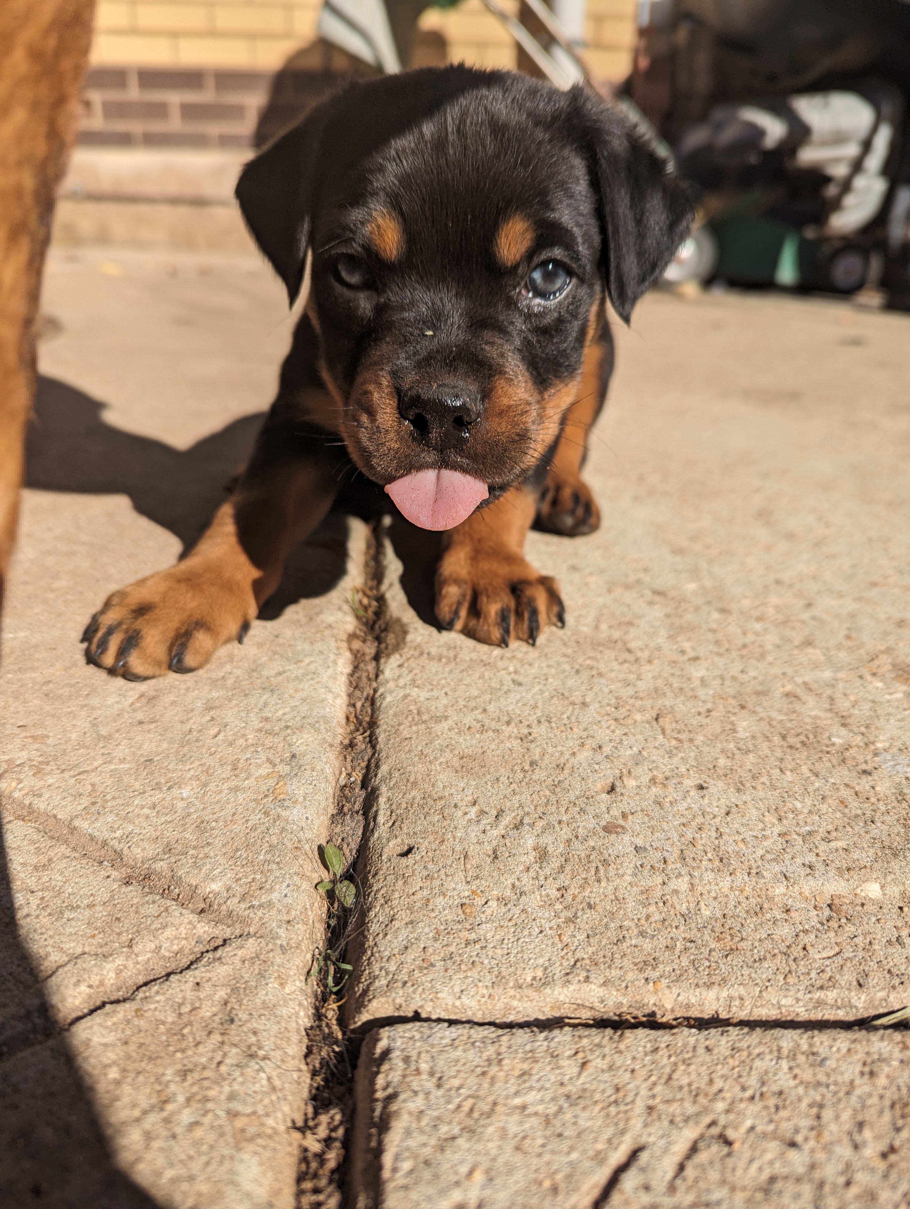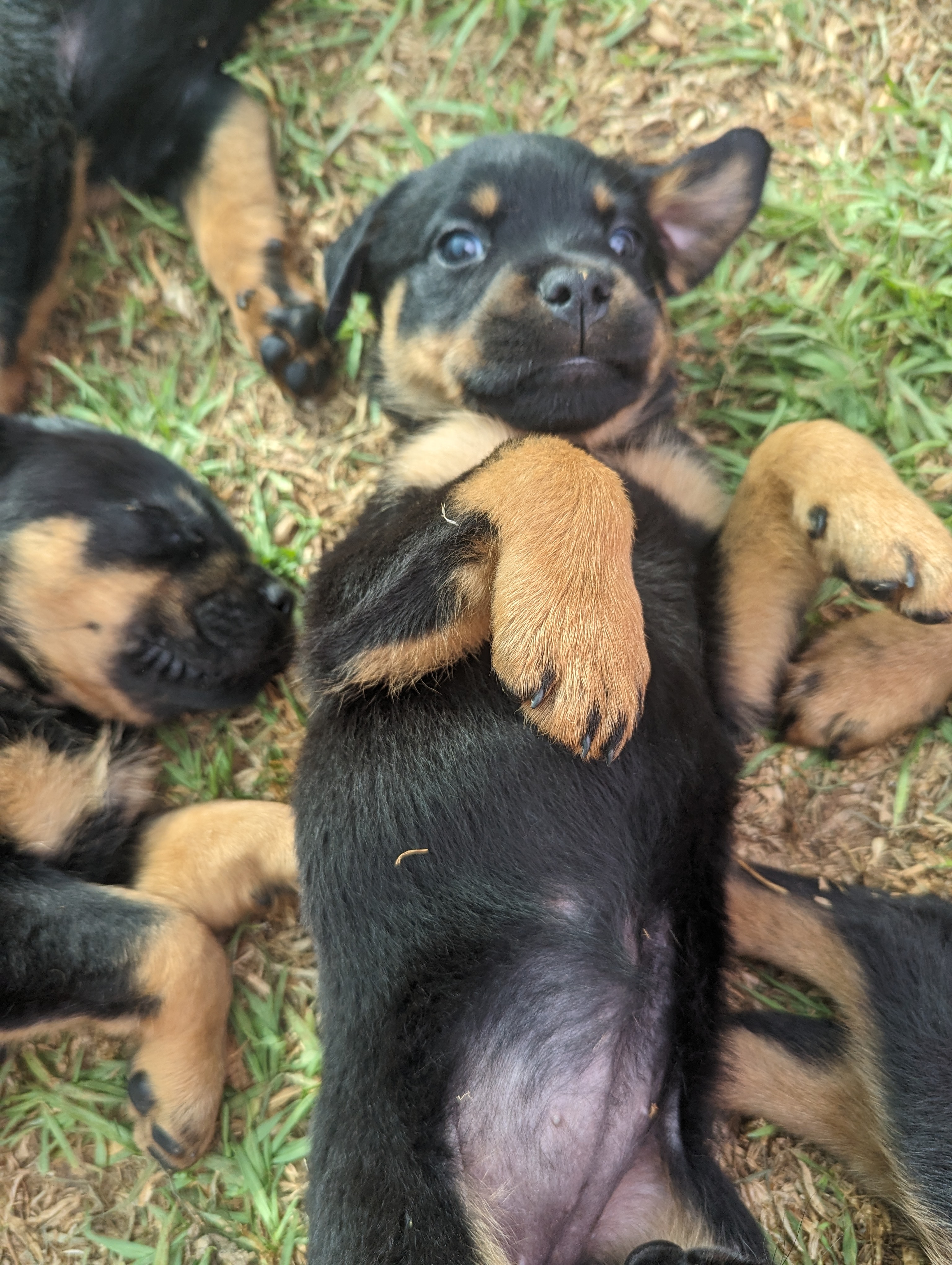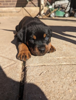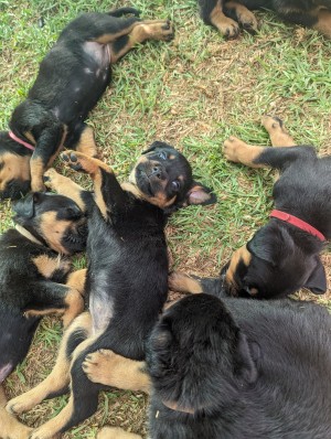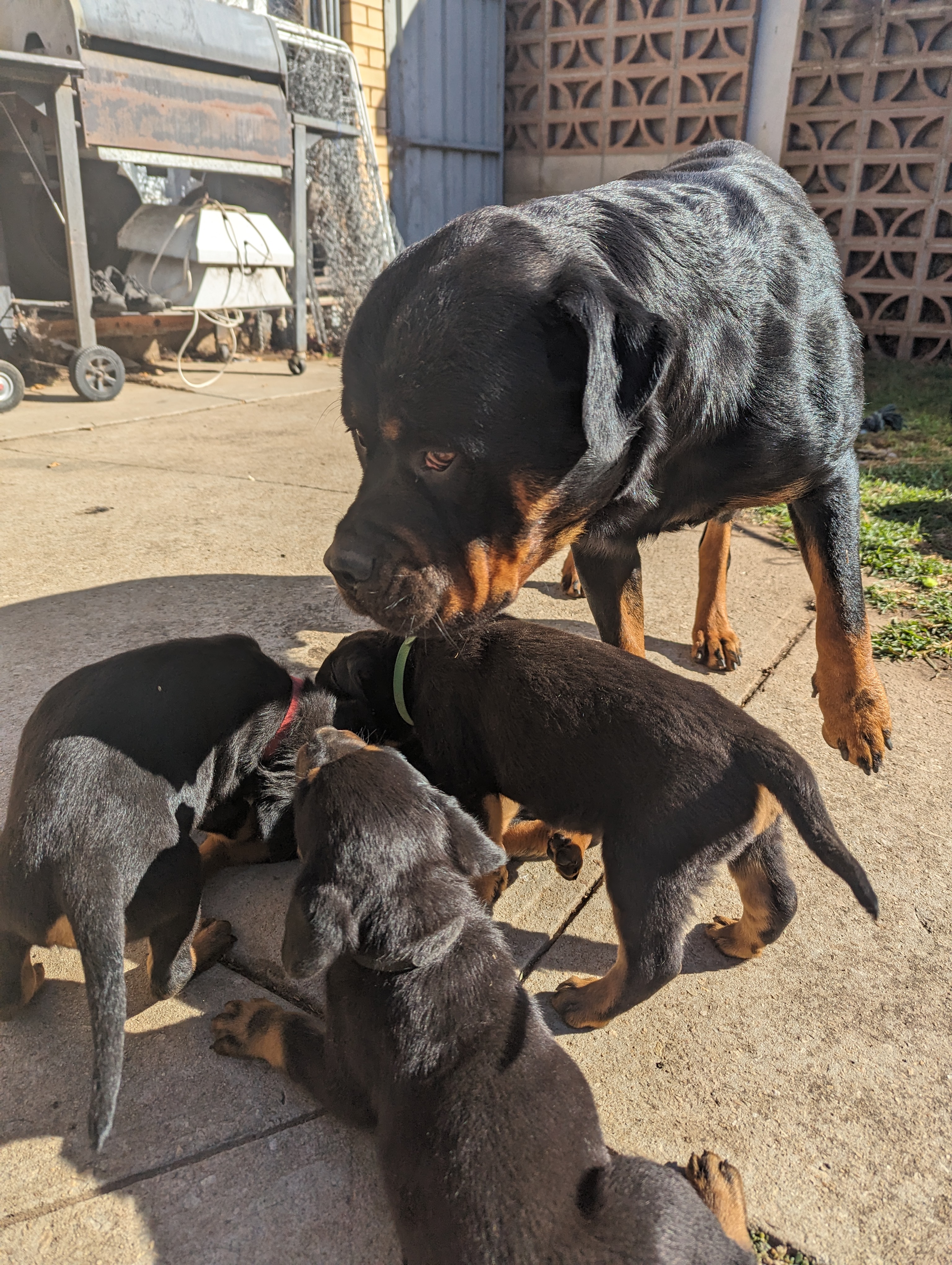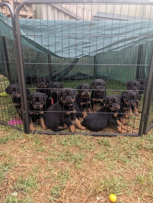 We own both parents and they are both 100% pure bred German Rotties, they have had their DNA tested and can provide report as proof. They are gentle giants and are both amazing with kids and have spent time with kids their entire lives. You are most welcome to meet them. Dad is 4 years old and is fully grown, while mum is still growing at 2 years old (they fully grow by 3 years old).