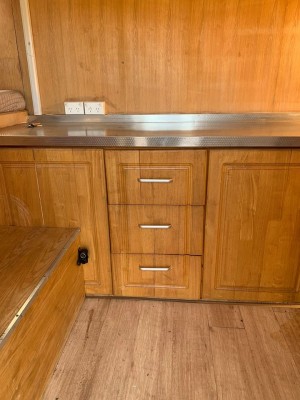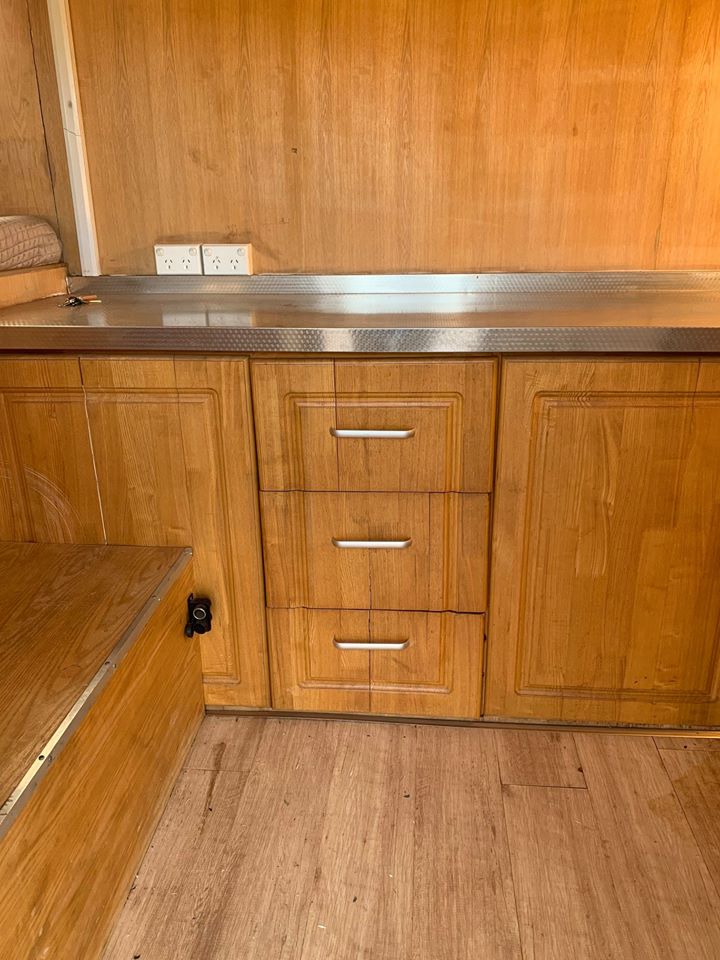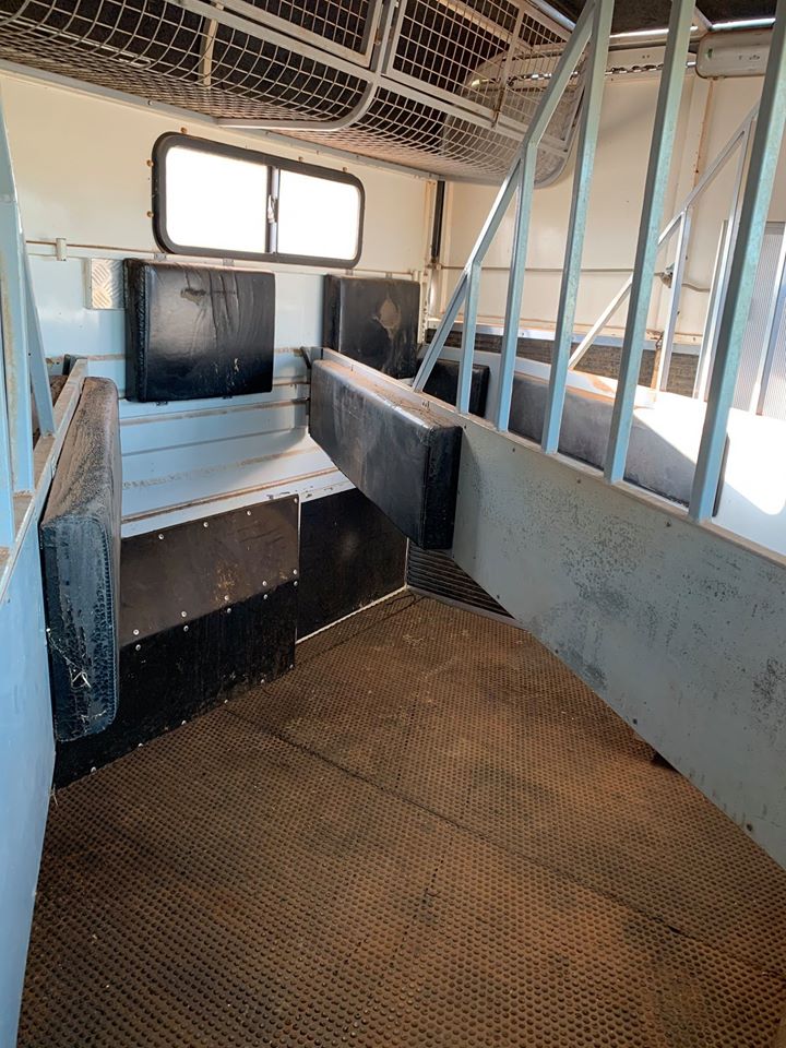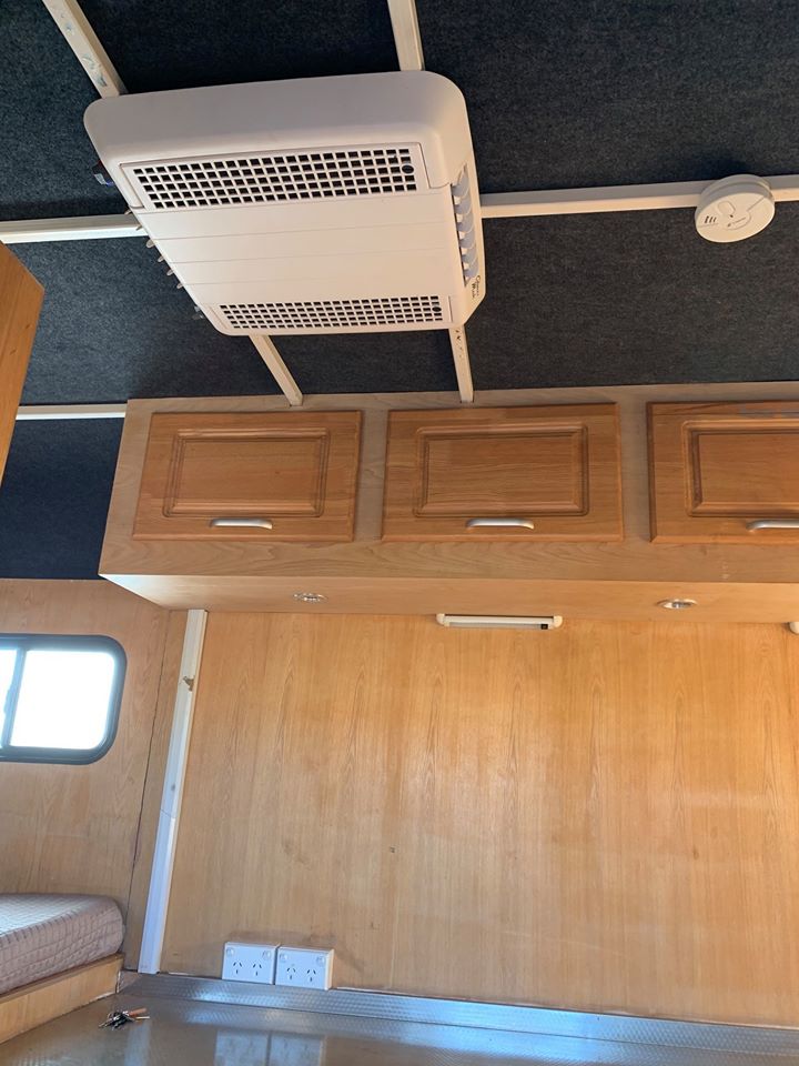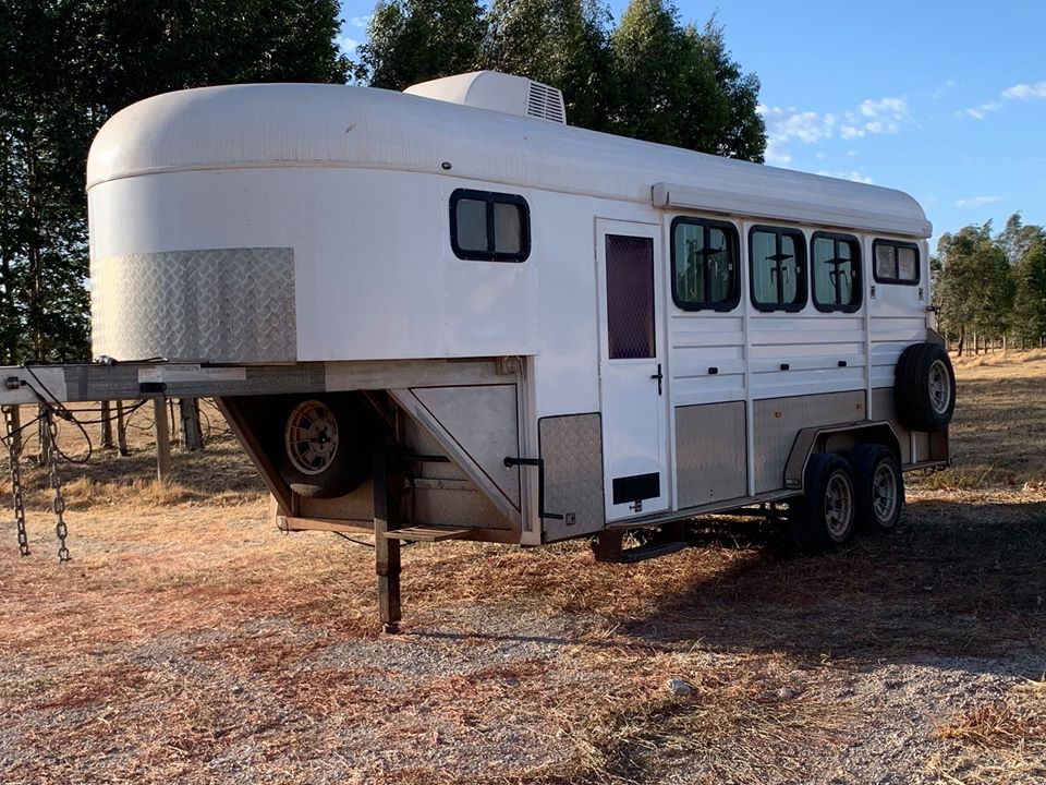 Air conditioning, power, awning, 2 spare tyres, swing out tack box, pop up vents, enclosed over rump rug rack, storage.