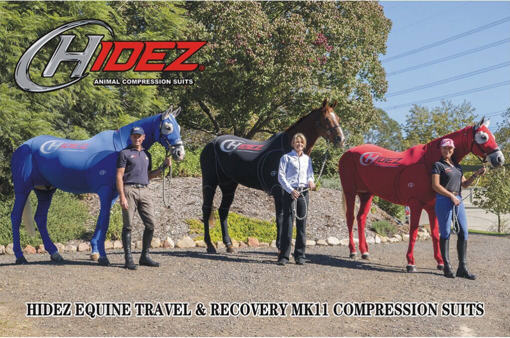 ‘HIDEZ’ Suits, Hoods and Socks are used before and after, Competition and Exercise, during transport, and to assist with recovery after injury or surgery.